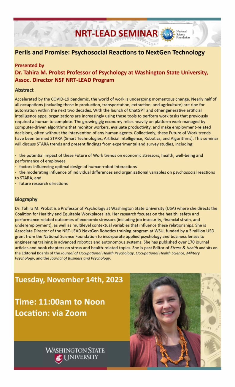 Speaker: Dr. Tahira Probst, Professor, Department of Psychology, Washington State University